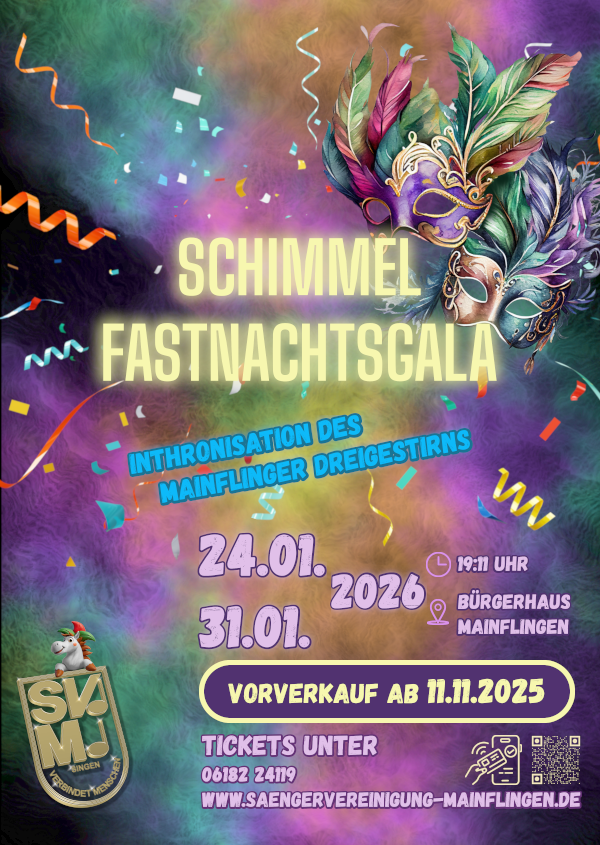 Der Vorverkauf für die Schimmel Fastnachtgalas am 24. & 31.01.2026 startet am 11.11.2025. Karten gibt es unter 06182-24119 oder hier auf der Homepage